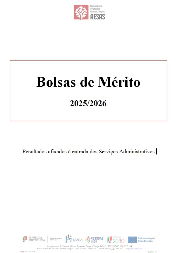 Avisam-se os interessados, que já se encontram afixados os resultados relativos às Bolsas de Mérito para o ano letivo 2025/2026. A listagem encontra-se afixada à entrada dos serviços administrativos. #AESAS #BolsasdeMérito